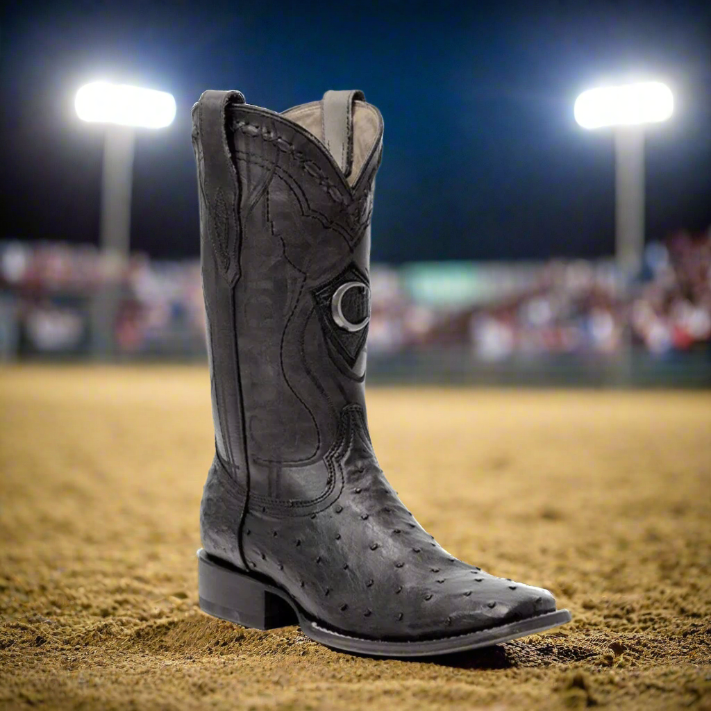 Cuadra botas cowboy rodeo exóticas piel de avestruz de pluma completa NEGRO para hombre. Botas estilo western con horma cuadrada ancha.