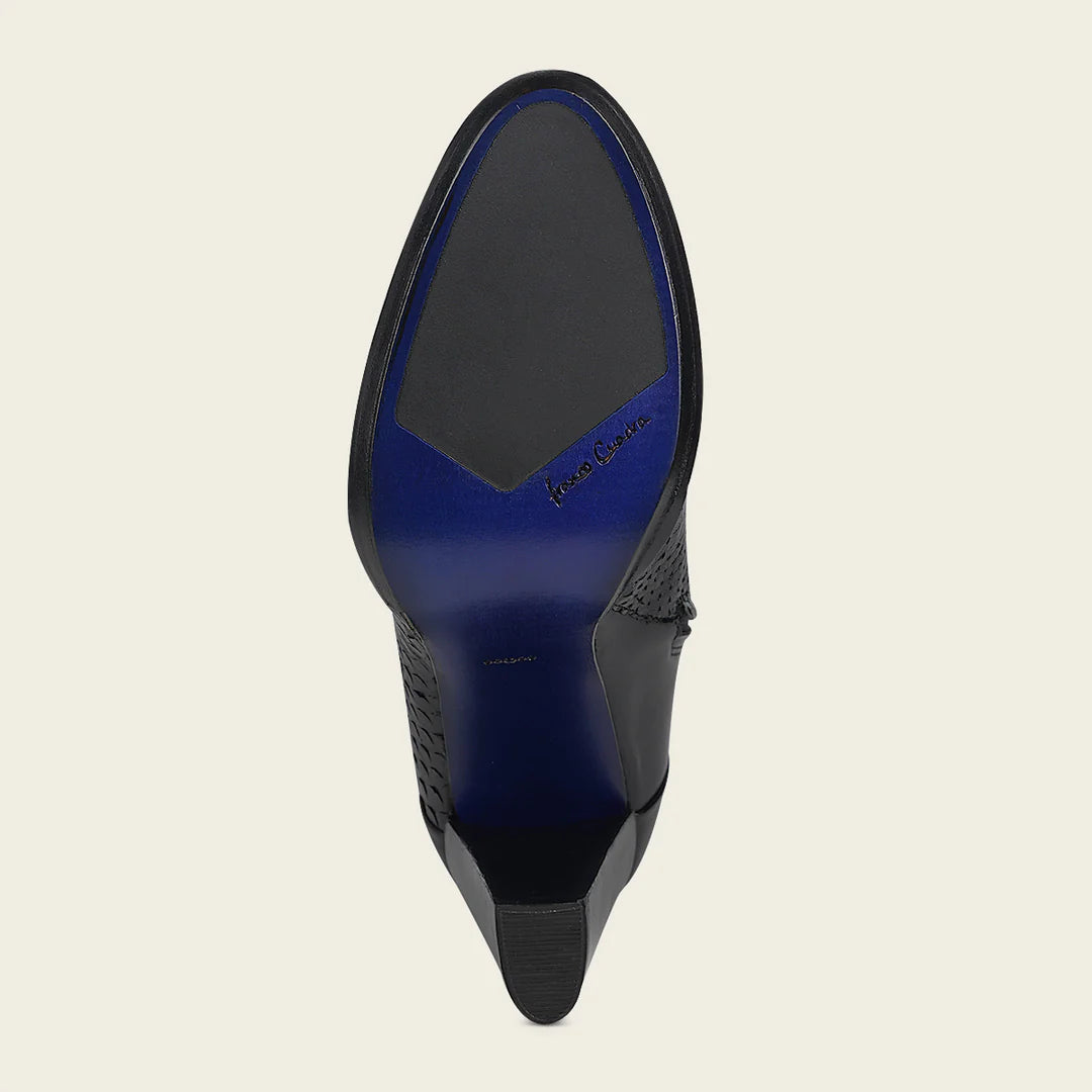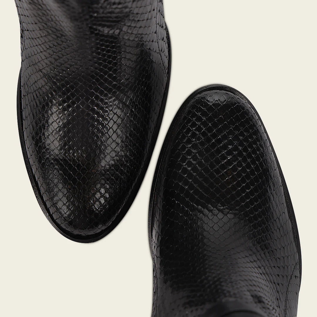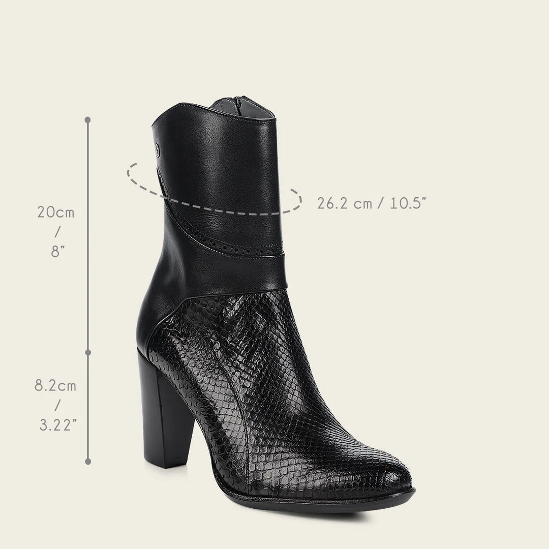 Elevate your fashion game with Franco Cuadra's black python skin ankle boots for women. Crafted with genuine cowhide leather and a round toe design, these handmade boots offer unmatched quality. The luxurious leather lining and nonslip sole make these boots a must-have for any stylish woman. Made in Leon Mexico.