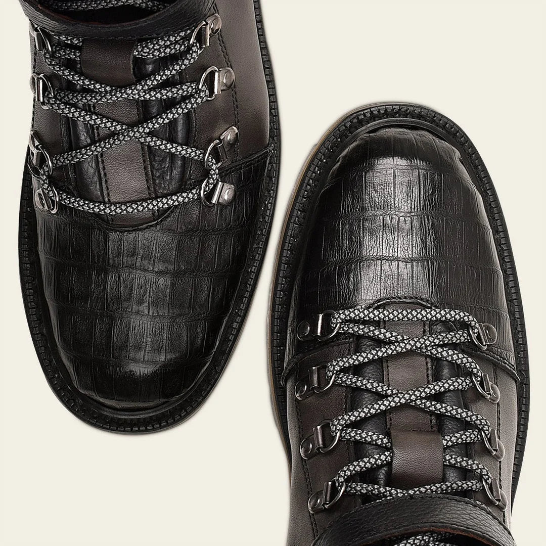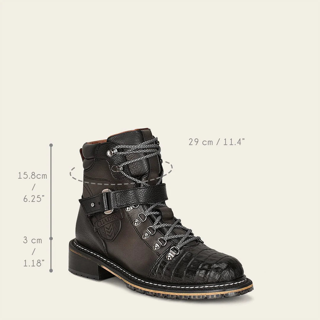 Indulge in the extraordinary with the Cuadra black casual fashion caiman ankle boots for men. These laced ankle boots boast genuine caiman leather and are designed in a round toe hiking style - perfect for the adventurous man. Expertly crafted with Goodyear welt construction, these boots are the epitome of quality. Complete with a leather lining and nonslip sole, these boots are handmade in Leon Mexico for an unbeatable combination of style and comfort.