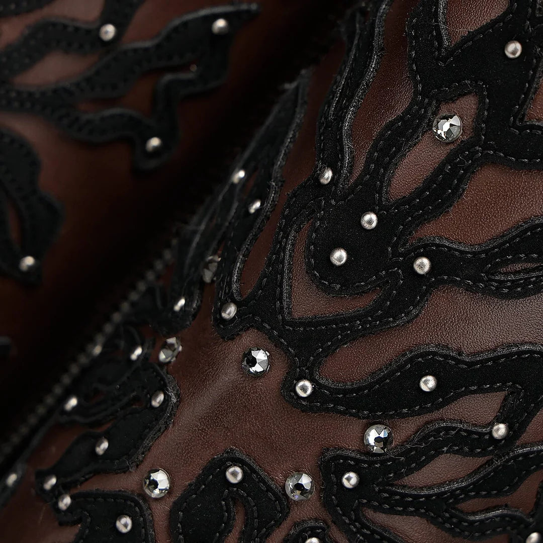 This beautiful bootie is made for women from genuine cowhide and bovine leather. It features intricate handwoven details and a leather sole with TPU injection. The construction uses the Goodyear Welt method, and the heel stands at an impressive 3 1/4 inches. With its polished finish, these boots will surely make a statement everywhere you go.
