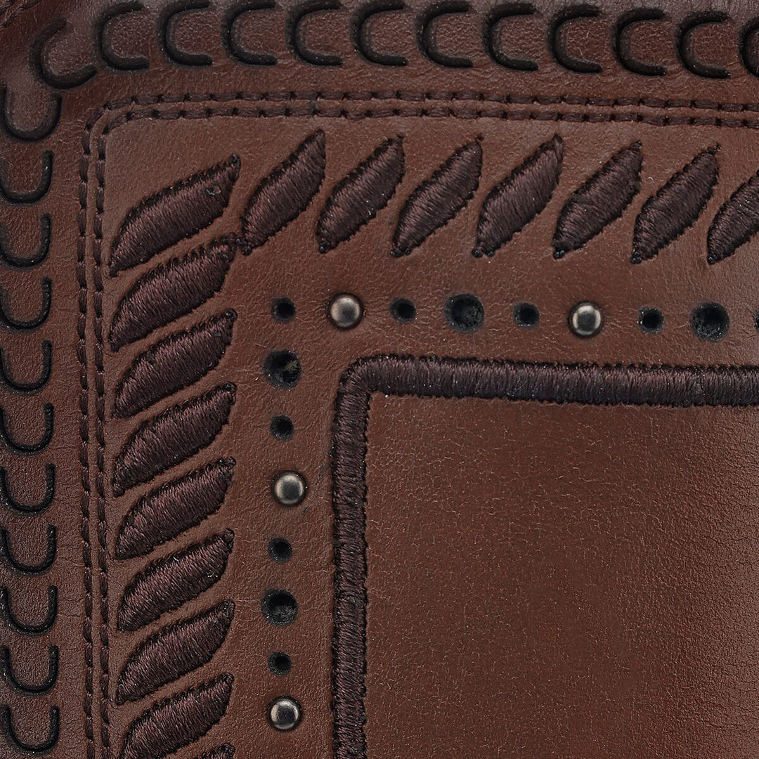 Introducing the Cuadra brown western cowgirl cowhide leather ankle boots for women! Experience the finest quality and craftsmanship with these stylish boots, featuring a pointy J toe and stunning studded design. Handmade with Goodyear welt construction, these boots boast a leather lining and nonslip sole for comfort and durability. Made in Leon, Mexico, these boots are a must-have for any fashion-forward individual. Add a touch of western charm to your wardrobe today!