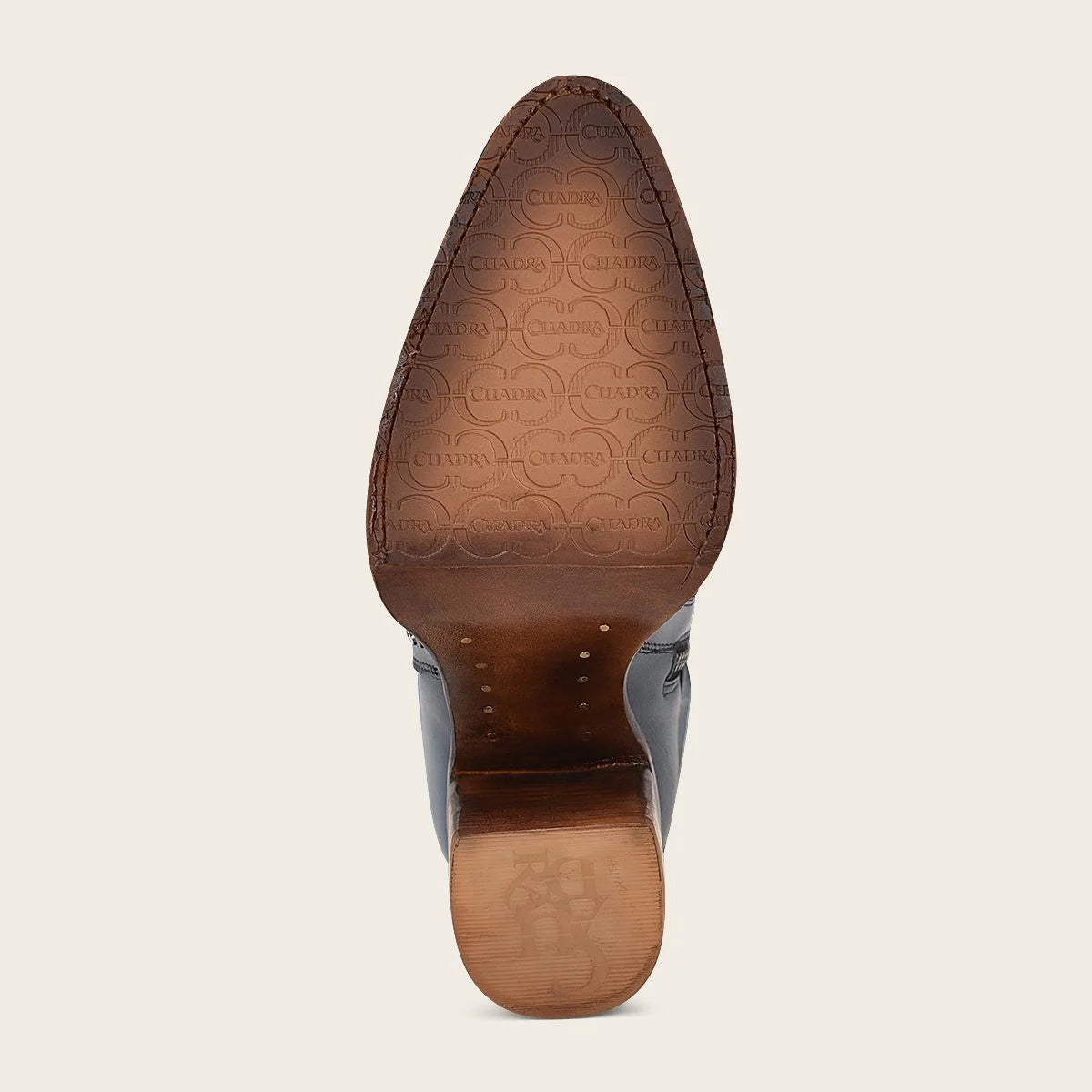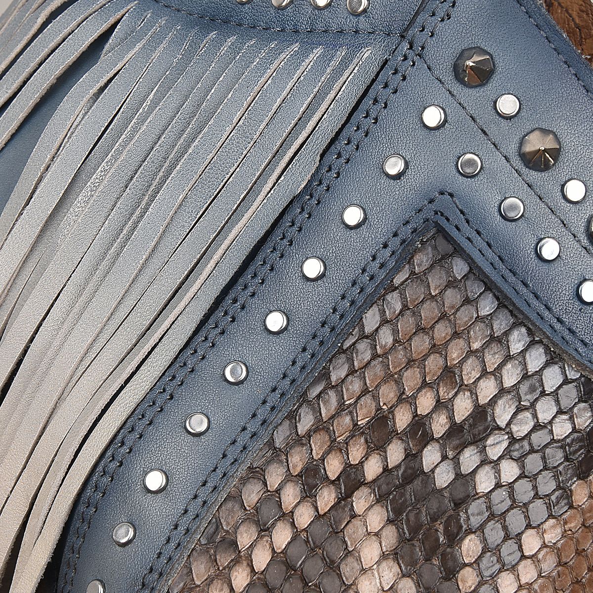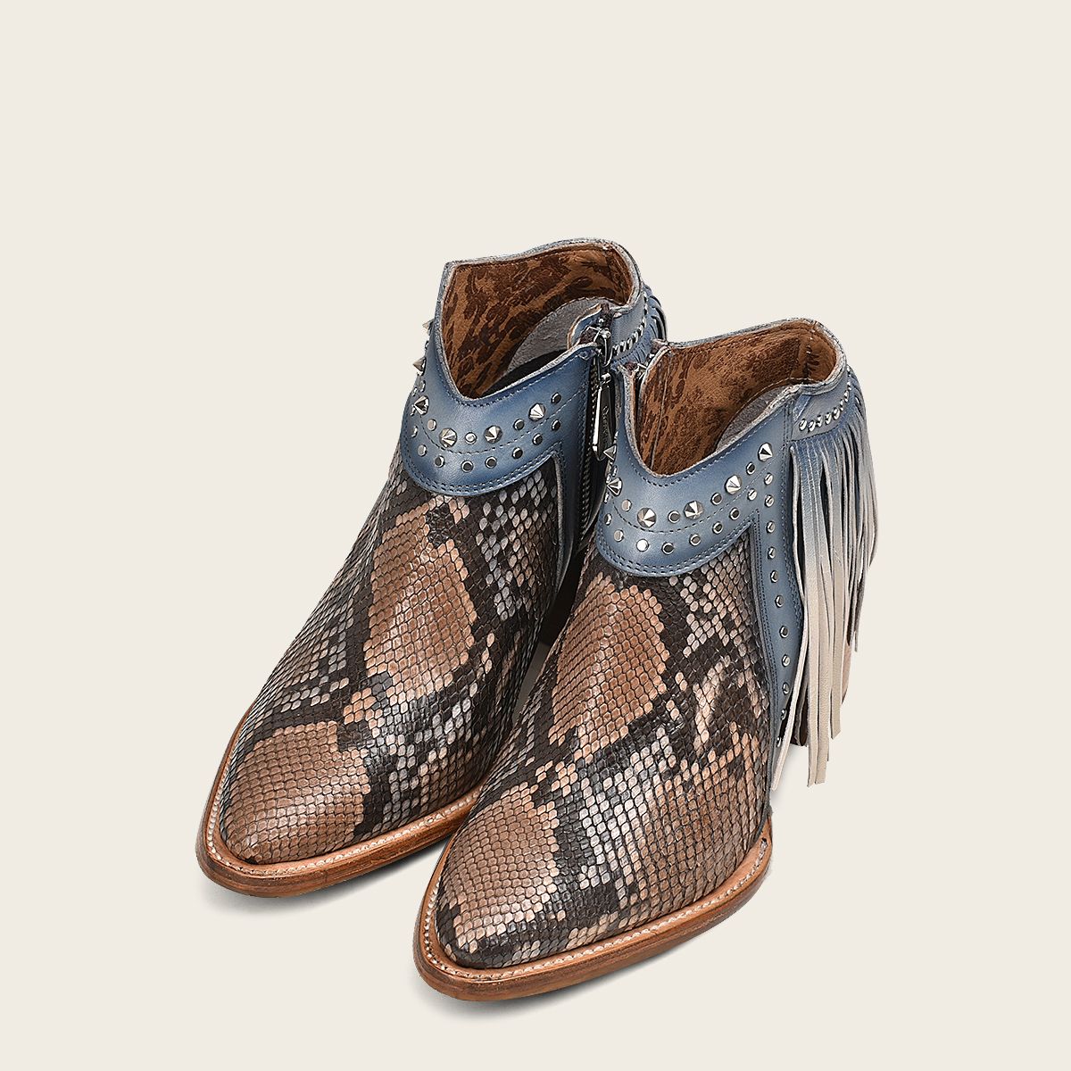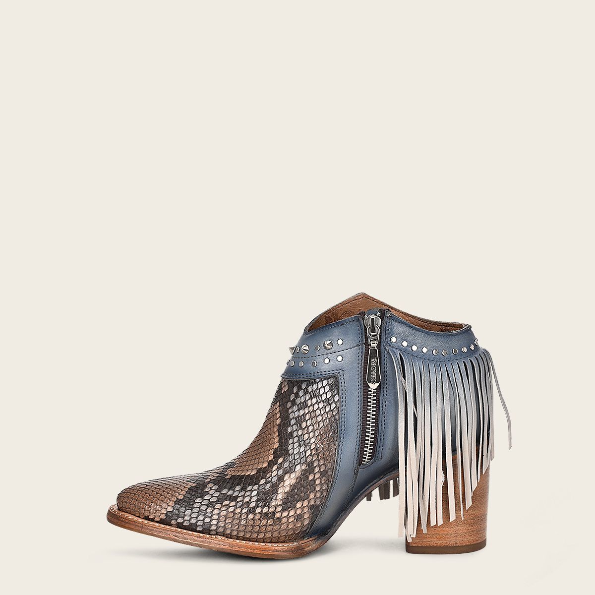 Experience the ultimate in western cowgirl fashion with our Cuadra blue python skin ankle boots. Handcrafted in Leon, Mexico with a Goodyear welt construction, these boots feature fringe details and a stylish J toe design. The genuine leather lining and nonslip sole provide comfort and durability, making them the best handmade boots for any occasion. Elevate your wardrobe with these stunning ankle boots today!