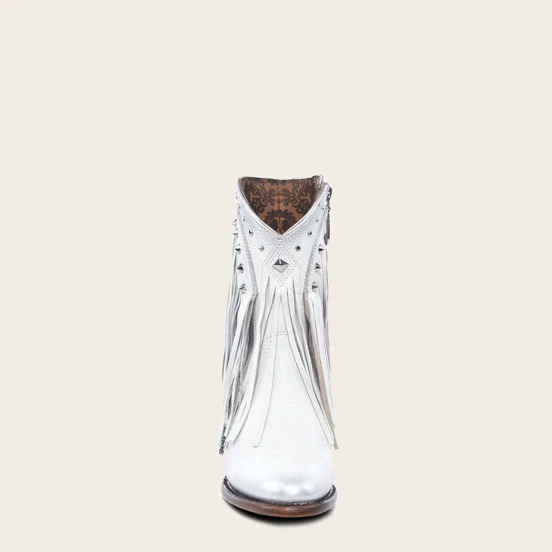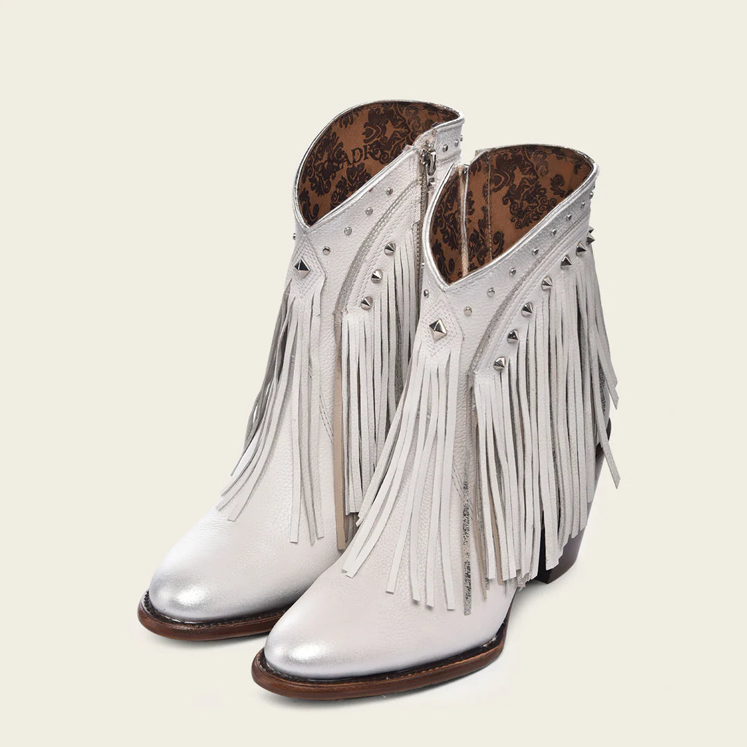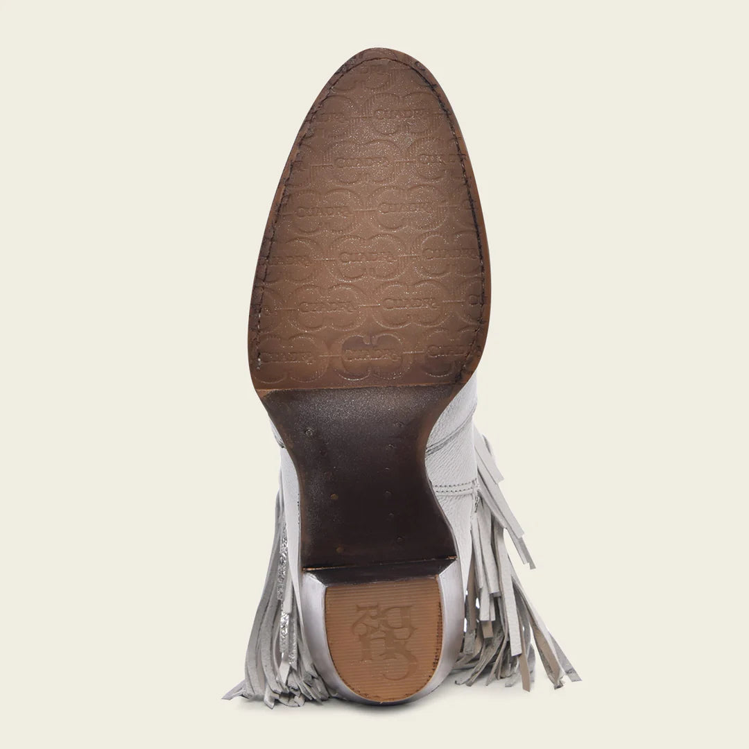 Experience the ultimate in cowgirl chic with these Cuadra white western cowgirl leather boots for women. Made with genuine cowhide leather and featuring exquisite embroidered details, these boots are the epitome of handcrafted excellence. The Goodyear welt construction ensures durability, while the luxurious leather lining and nonslip sole provide unmatched comfort and style. Handmade in Leon Mexico, these boots are adorned with studs and fringes, making them a must-have addition to any stylish wardrobe.
