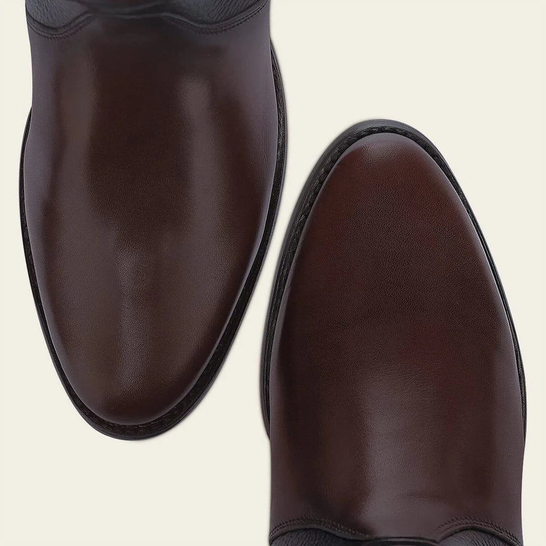 Experience ultimate style and luxury with our Cuadra chocolate casual cowhide leather strapped tall boots for women. Made from genuine cowhide leather, these tall boots feature an elastic mesh on the shaft with laser details and a leather strap for added flair. Handmade with precision using Goodyear welt construction and a leather lining, these boots provide unbeatable comfort and a nonslip sole for added stability. Made in Leon, Mexico, these boots are the epitome of high-quality craftsmanship and fashion for the modern woman.
